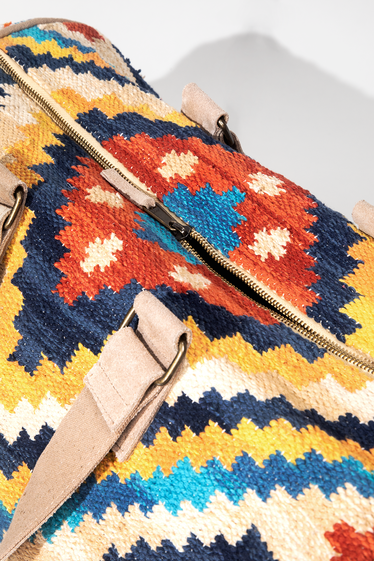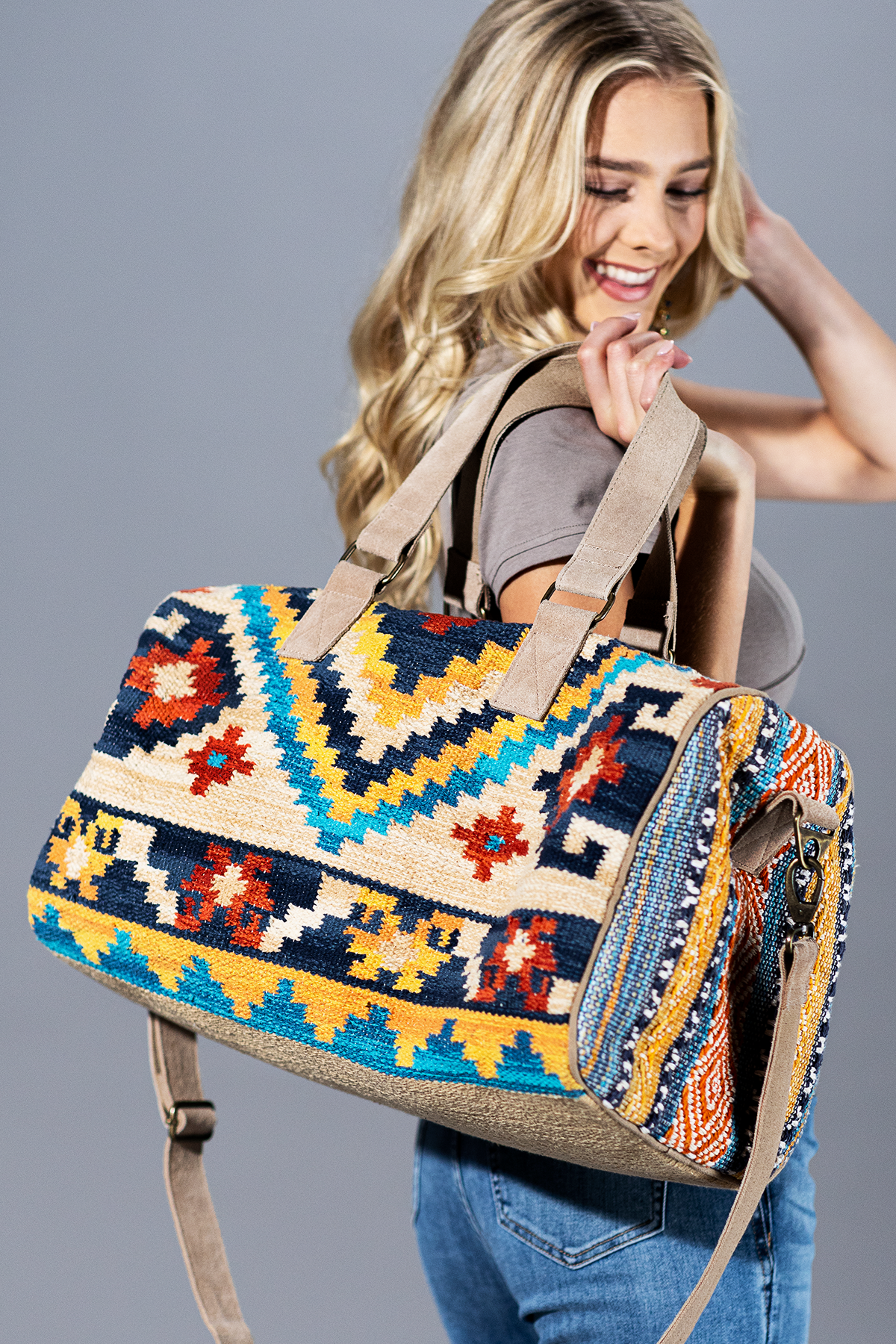 Crafted for the road trip dreamers and weekend wanderers. The Sunset Mesa Weekender brings bold, Southwestern-inspired patterns to life with handwoven detail and genuine suede accents. Spacious enough for a getaway, yet stylish enough for everyday, it’s the kind of bag that looks even better with a little mileage on it.