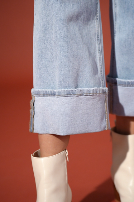 Super high rise, super relaxed, and super cute. These cuffed baggy jeans bring a laid-back charm to any outfit with their oversized cuffs and soft light wash. They’re the go-to denim for days when you want to look styled without trying.