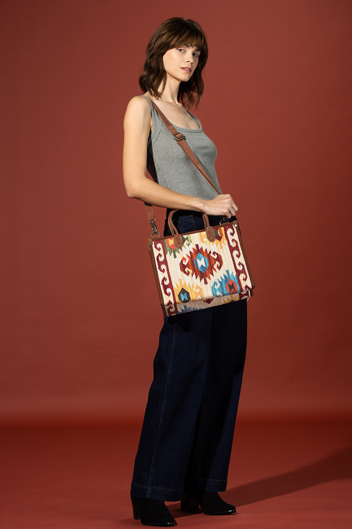 Handwoven from 100% cotton and finished with genuine suede handles, the Taos Traveler Tote blends artistry and function in perfect balance. An adjustable shoulder strap makes it easy to carry from weekday errands to weekend getaways. Every pattern is inspired by the colors and culture of the Southwest.