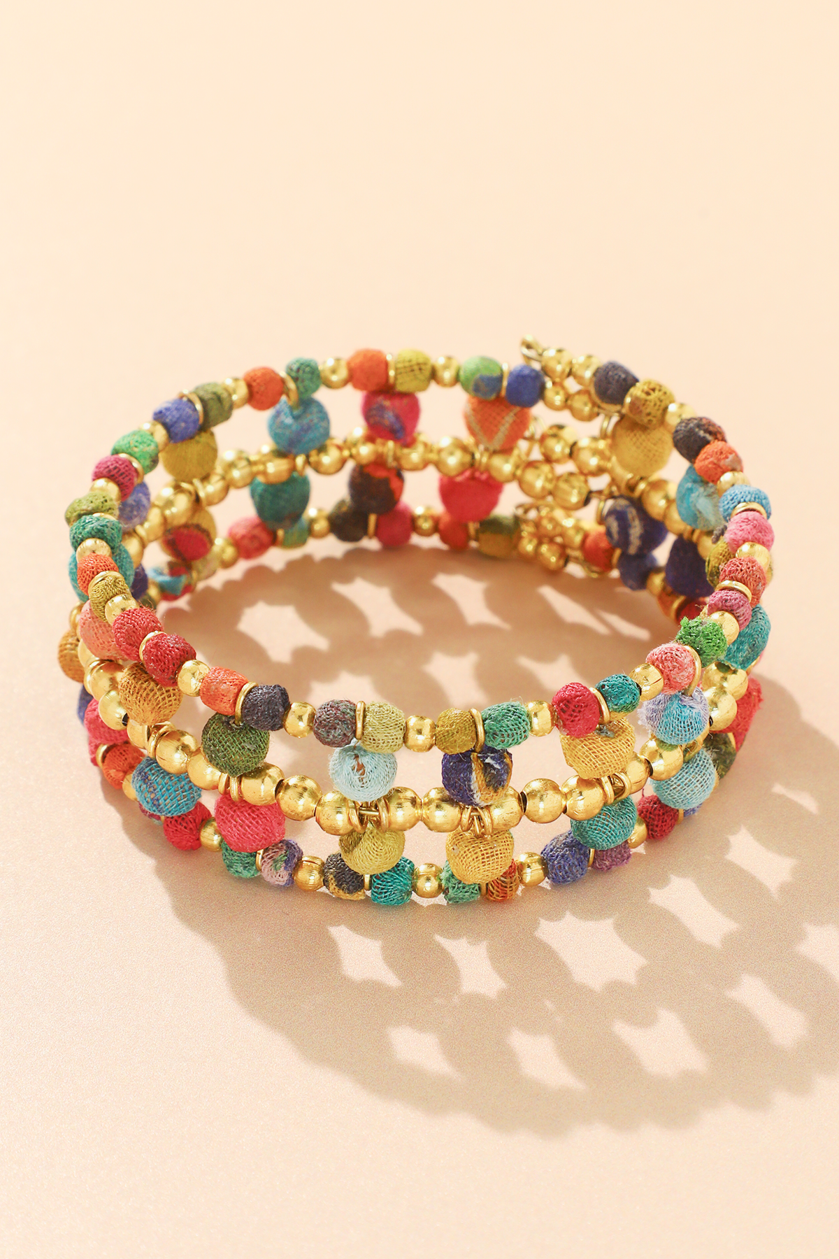 Eye-catching cuff bracelet featuring hand-wrapped cotton beads—bold textures and an abstract design for a standout look. Crafted with care and sustainability in mind, our accessories showcase the beauty of upcycled Sari textiles. Each piece tells a unique story, born from the vibrant traditions of Indian craftsmanship and lovingly handcrafted by skilled women artisans. Every bead and fabric element is one-of-a-kind, ensuring that no two accessories are exactly alike. Due to the nature of repurposed materials, each item features its own distinct blend of colors and patterns, from the individual beads to the fabric components. This variation is not just a feature, but a celebration of authenticity and eco-conscious design. By choosing our accessories, you support both environmental responsibility and the empowerment of women artisans in India, while embracing a truly unique piece of wearable art.