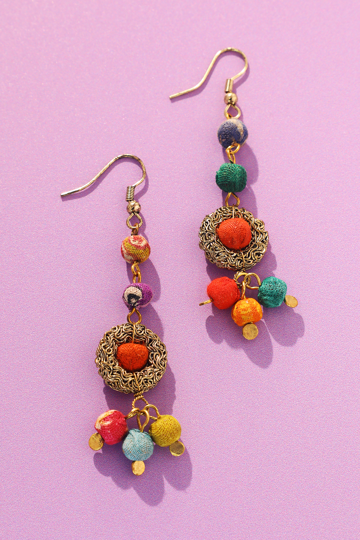 Brass earrings featuring graduated cotton-wrapped beads in a striking, descending design—textured, graceful, and charmingly original. Crafted with care and sustainability in mind, our accessories showcase the beauty of upcycled Sari textiles. Each piece tells a unique story, born from the vibrant traditions of Indian craftsmanship and lovingly handcrafted by skilled women artisans. Every bead and fabric element is one-of-a-kind, ensuring that no two accessories are exactly alike. Due to the nature of repurposed materials, each item features its own distinct blend of colors and patterns, from the individual beads to the fabric components. This variation is not just a feature, but a celebration of authenticity and eco-conscious design. By choosing our accessories, you support both environmental responsibility and the empowerment of women artisans in India, while embracing a truly unique piece of wearable art.