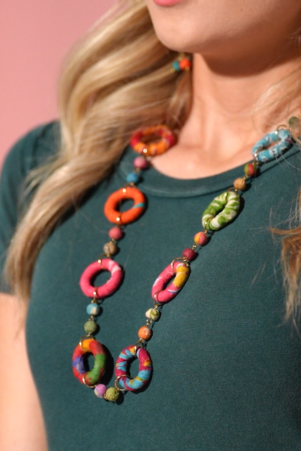 Timeless handmade necklace featuring decorative rings—crafted with upcycled sari textiles for a refined and stylish statement. Crafted with care and sustainability in mind, our accessories showcase the beauty of upcycled Sari textiles. Each piece tells a unique story, born from the vibrant traditions of Indian craftsmanship and lovingly handcrafted by skilled women artisans. Every bead and fabric element is one-of-a-kind, ensuring that no two accessories are exactly alike. Due to the nature of repurposed materials, each item features its own distinct blend of colors and patterns, from the individual beads to the fabric components. This variation is not just a feature, but a celebration of authenticity and eco-conscious design. By choosing our accessories, you support both environmental responsibility and the empowerment of women artisans in India, while embracing a truly unique piece of wearable art.