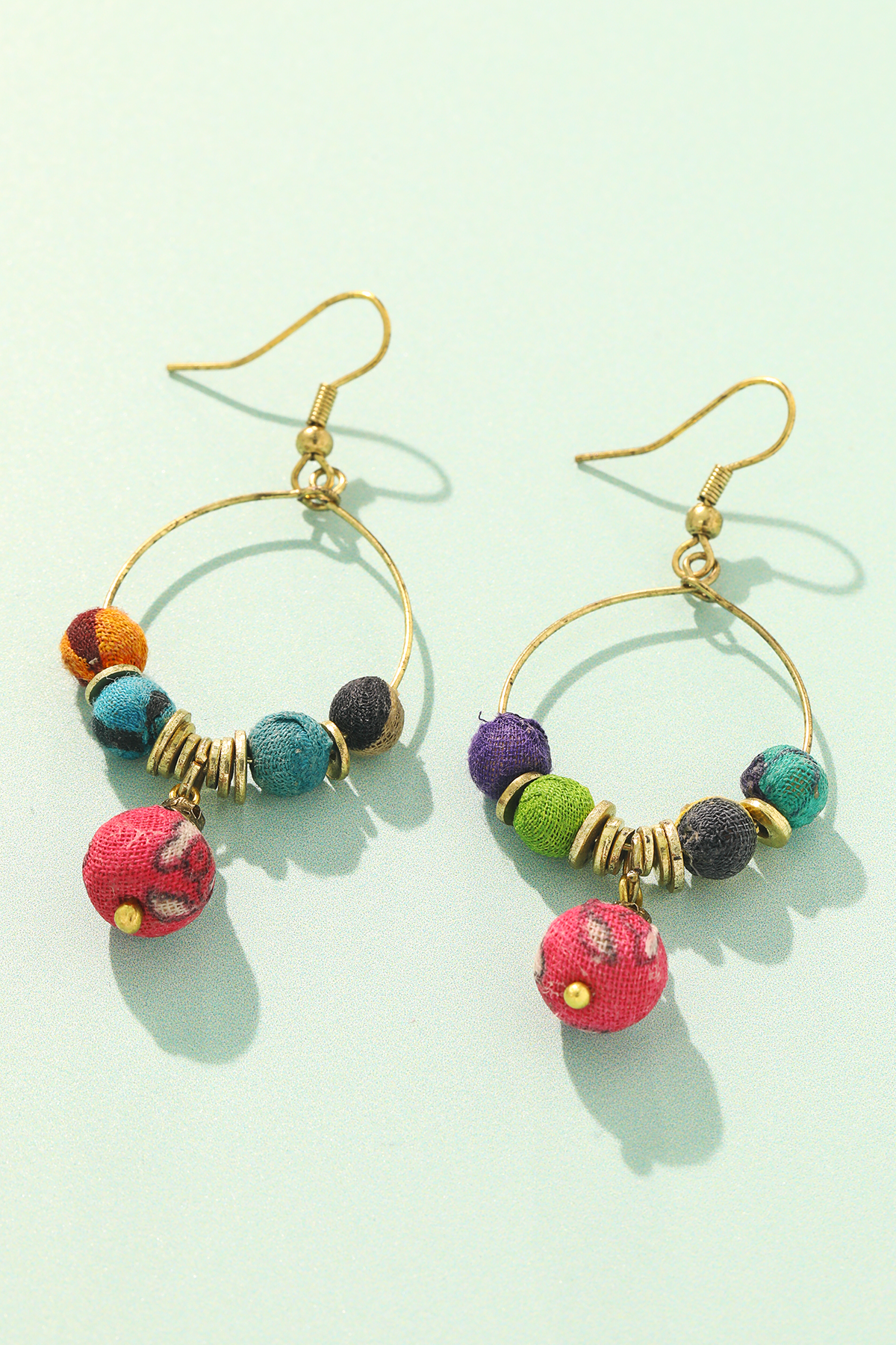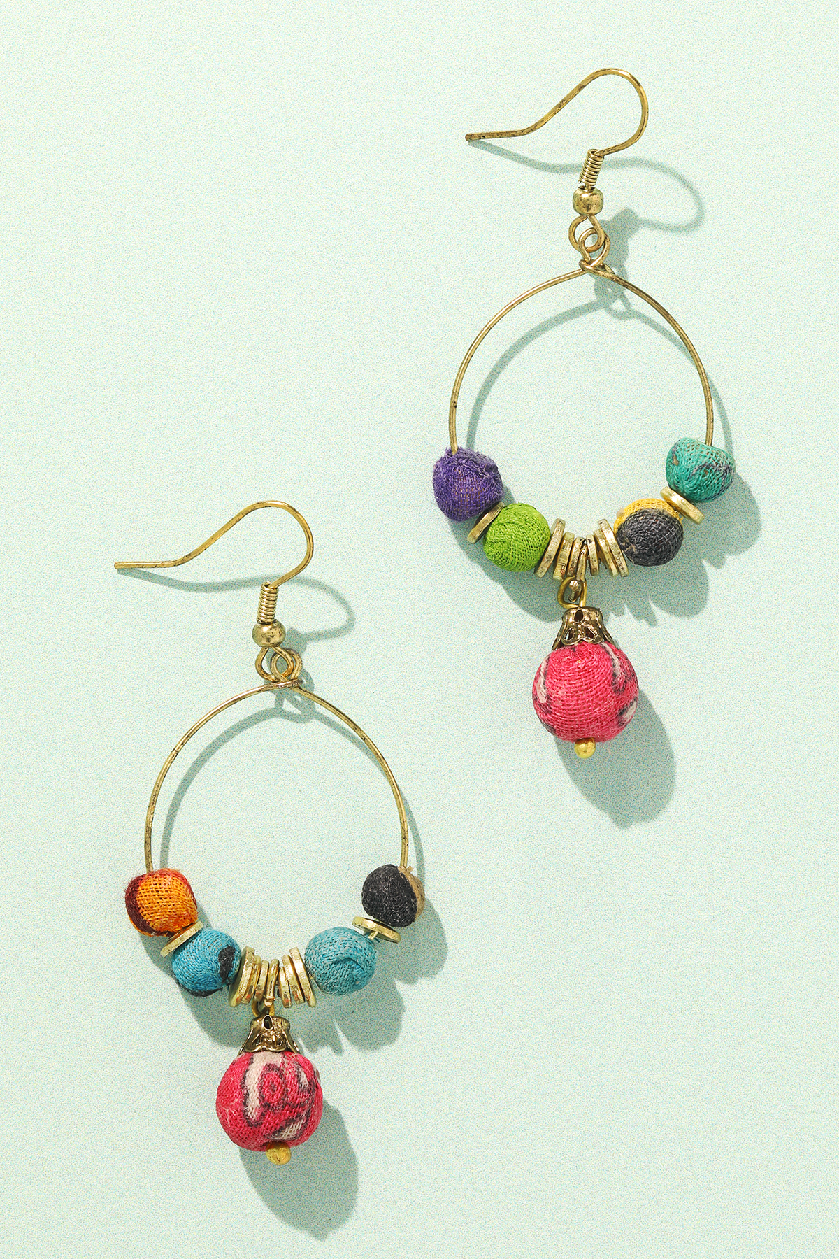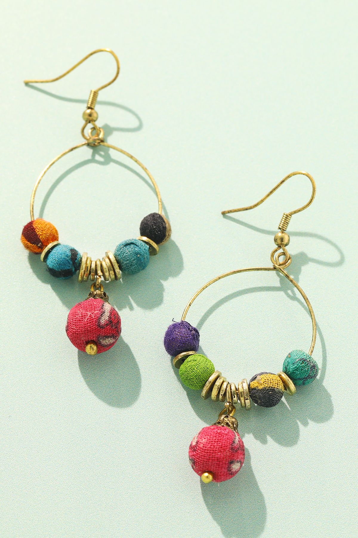 Beaded wire hoops with a dangling accent—colorful, handcrafted, and effortlessly stylish. Crafted with care and sustainability in mind, our accessories showcase the beauty of upcycled Sari textiles. Each piece tells a unique story, born from the vibrant traditions of Indian craftsmanship and lovingly handcrafted by skilled women artisans. Every bead and fabric element is one-of-a-kind, ensuring that no two accessories are exactly alike. Due to the nature of repurposed materials, each item features its own distinct blend of colors and patterns, from the individual beads to the fabric components. This variation is not just a feature, but a celebration of authenticity and eco-conscious design. By choosing our accessories, you support both environmental responsibility and the empowerment of women artisans in India, while embracing a truly unique piece of wearable art.