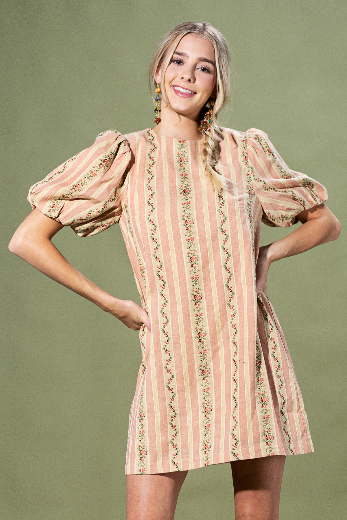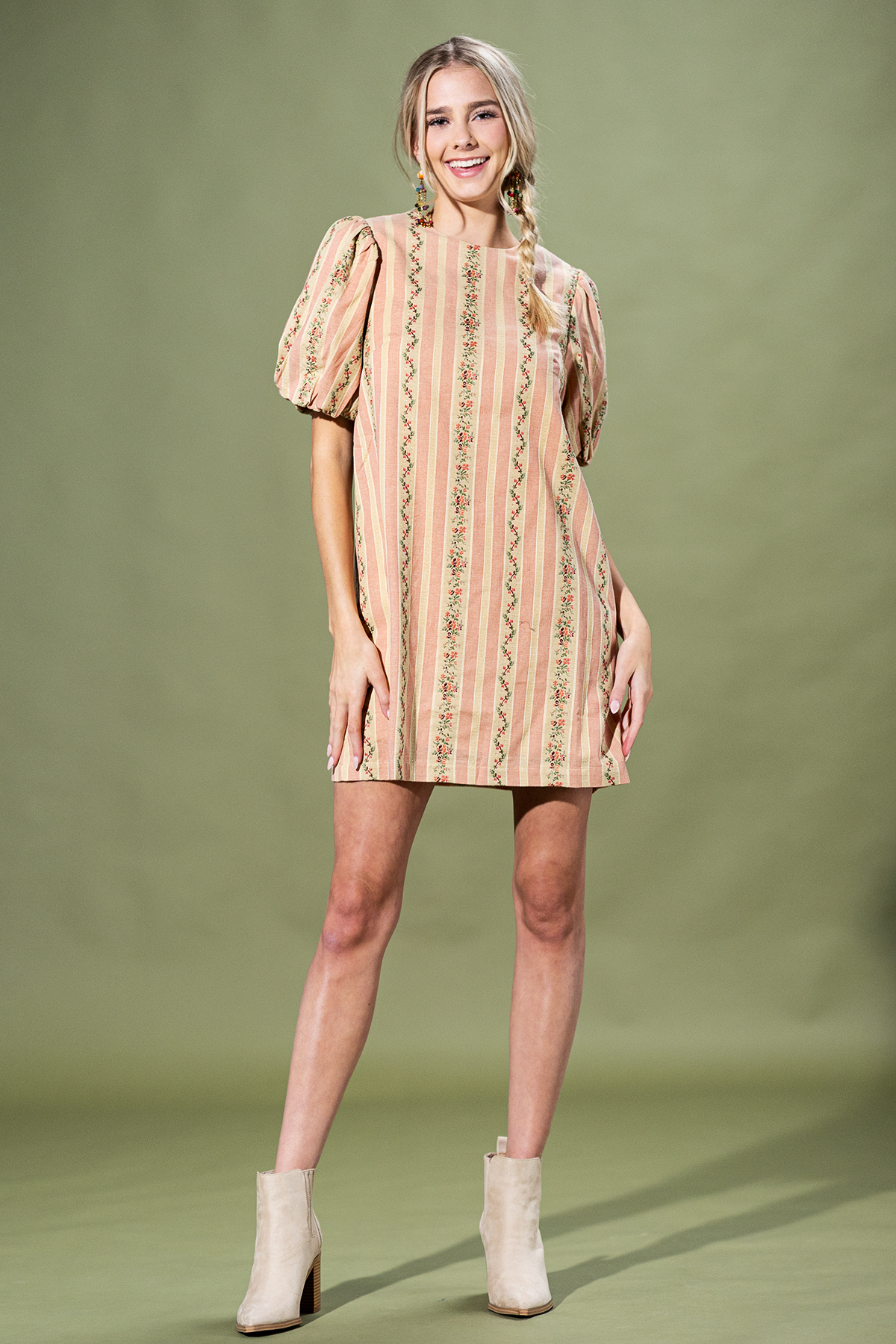 A sweet blend of nostalgia and polish, this mini dress feels straight out of a retro daydream. With soft blush and sand-toned stripes trimmed in delicate florals, it channels the charm of vintage wallpaper with a fresh, wearable twist. The puff sleeves add just the right amount of volume, giving it a feminine, romantic silhouette that flatters effortlessly.
