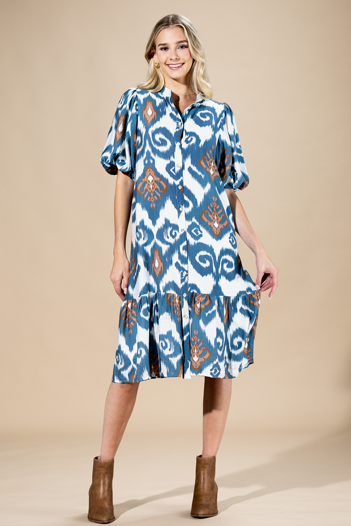 Bring bold movement and vintage flair into your day with this puff sleeve print dress. Designed with a flowing silhouette and button-up front, it captures that effortless retro charm Onedder is known for.