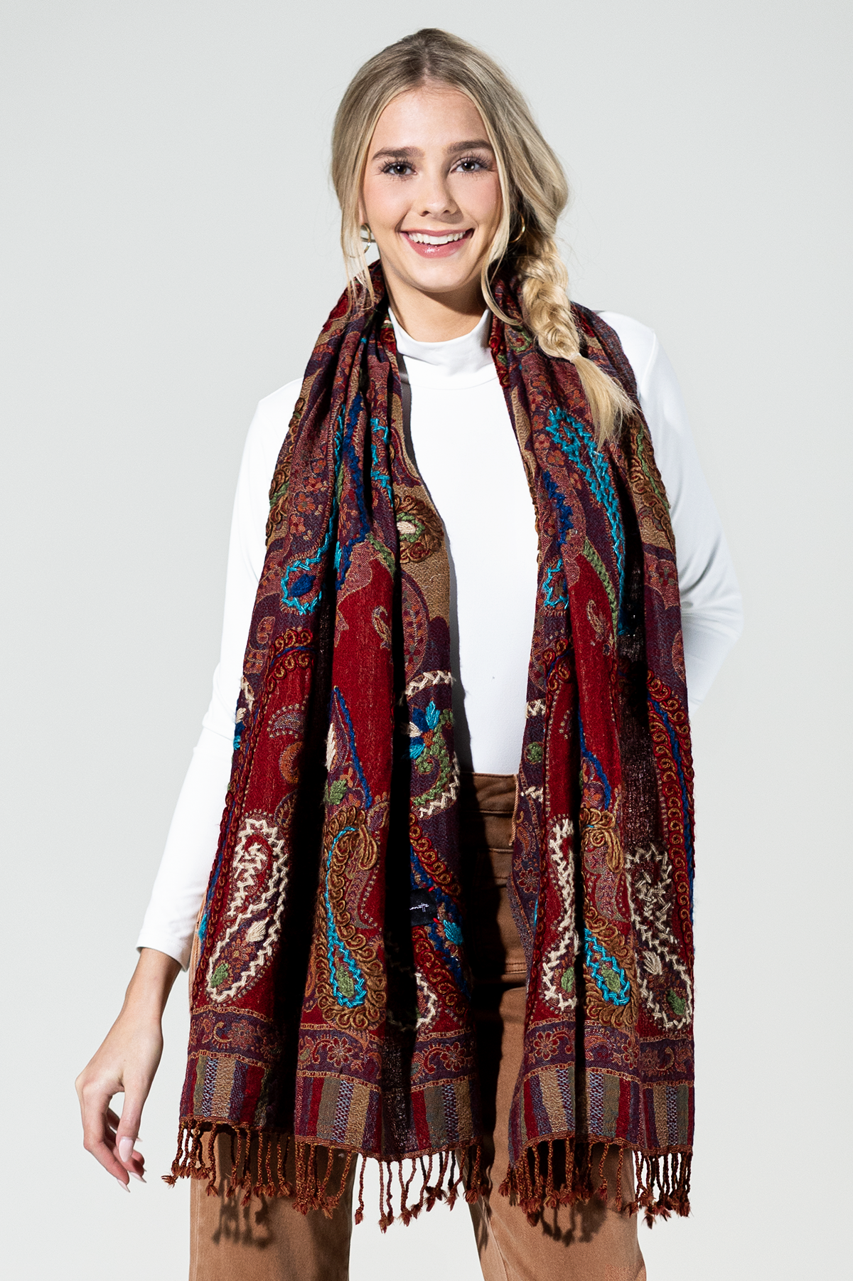 This handcrafted scarf is made from 100% wool, offering warmth and luxury with every wear. Featuring a beautiful artisan paisley design, it showcases vibrant hues and intricate detailing, perfect for adding a touch of bohemian elegance to any outfit. Soft yet durable, this scarf is a must-have for those who appreciate artisanal craftsmanship and timeless style.
